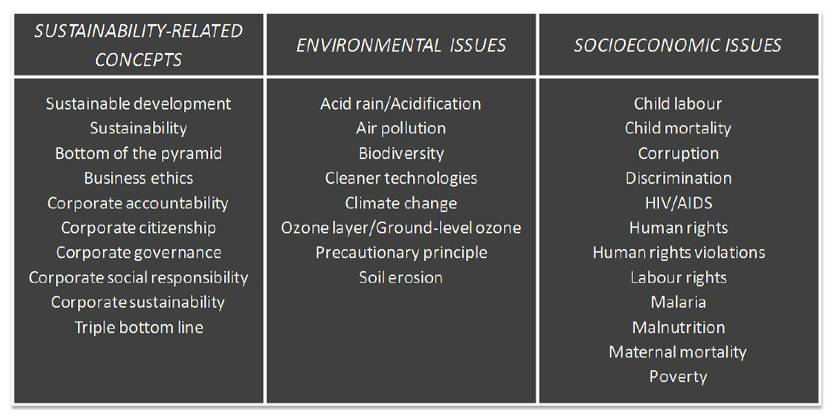 The method of data collection is basic text/data mining or knowledge discovery from textual databases, based on the search for specific words contained in the sample of documents. The sample consists of 115 national newspapers from 41 countries, comprising of approximately 69,000,000 articles from 369,000 issues of leading newspapers between January 1990 and May 2010. The selection of sustainability-related issues was based on the desk study of major international agreements and initiatives. Core documents were Agenda 21, UN Millennium Development Goals, UN Millennium Ecosystem assessment and the UN Global Compact. The selection of key terms was restricted by practical issues such as ambiguities of terms in a number of languages, or difficulties in translating a key term into a number of languages. The desk study resulted in the selection of 20 sustainability-related issues (Table below). Whilst this set of 20 issues is not meant to represent a conclusive list of sustainability-related issues, it nevertheless provides insight into attention given to issues that are commonly associated with sustainability and sustainable development. In addition, media coverage of 10 concepts commonly associated with the area of sustainability (including the term sustainability) was analysed. On the level of sustainability-related concepts, the analysis was restricted to 62 English-language newspapers for reasons of comparability.