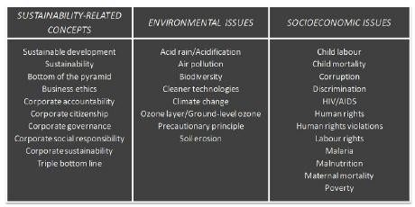 The method of data collection is basic text/data mining or knowledge discovery from textual databases, based on the search for specific words contained in the sample of documents. The sample consists of 115 national newspapers from 41 countries, comprising of approximately 69,000,000 articles from 369,000 issues of leading newspapers between January 1990 and May 2010. The selection of sustainability-related issues was based on the desk study of major international agreements and initiatives. Core documents were Agenda 21, UN Millennium Development Goals, UN Millennium Ecosystem assessment and the UN Global Compact. The selection of key terms was restricted by practical issues such as ambiguities of terms in a number of languages, or difficulties in translating a key term into a number of languages. The desk study resulted in the selection of 20 sustainability-related issues (Table below). Whilst this set of 20 issues is not meant to represent a conclusive list of sustainability-related issues, it nevertheless provides insight into attention given to issues that are commonly associated with sustainability and sustainable development. In addition, media coverage of 10 concepts commonly associated with the area of sustainability (including the term sustainability) was analysed. On the level of sustainability-related concepts, the analysis was restricted to 62 English-language newspapers for reasons of comparability.